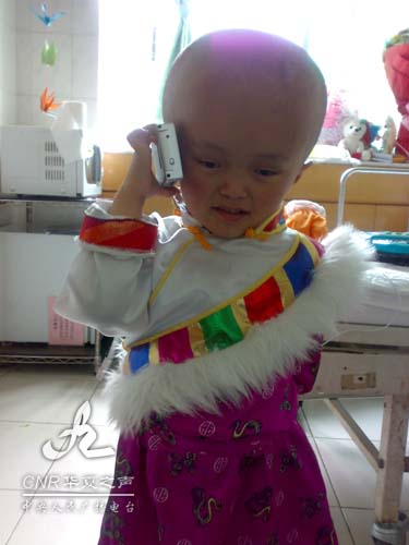 3個小時后,手術(shù)順利完成。等待了許久的手術(shù)室大門終于打開了,一直蹲在門邊的舅舅羅絨騰地躍了起來。小措姆被推出手術(shù)室,這時的她是清醒的,不停低聲哭著。舅舅趕忙迎上去摸著小措姆的臉蛋,不停地安慰著她,可小措姆還在哭泣。突然,藏族歌手阿浪多杰用手機播放了一首藏族的祝酒歌,小措姆聽到后竟神奇地止住了哭聲,逐漸地進入了夢鄉(xiāng)……