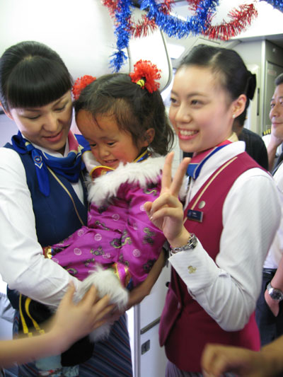 剛登上飛機的益登措姆顯得有點害羞