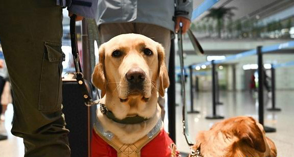 導(dǎo)盲犬“辛迪”“卡門”乘機(jī)記:身著紅色工作服 全程不吵不鬧