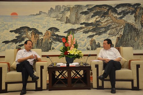 中央臺副總編輯杜嗣琨(左)在會見時向山東省委常委、宣傳部部長孫守剛介紹港澳媒體采訪團基本情況