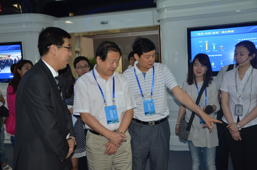 港澳媒體采訪團采訪浪潮集團,中央臺副總編輯杜嗣琨(左二)、華夏之聲總監韓長江(右三)與浪潮集團工作人員交流