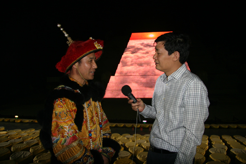 華夏之聲總監韓長江(右)采訪封禪大典演員