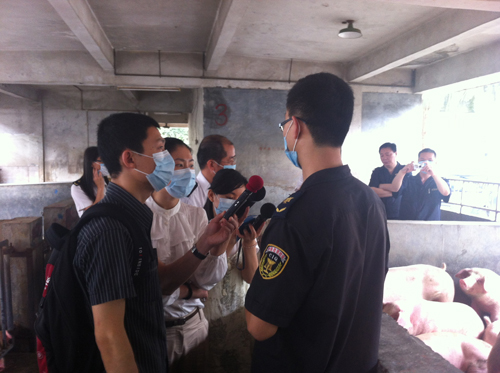 華夏之聲記者李鵬飛(左一)采訪供港澳活豬中轉倉