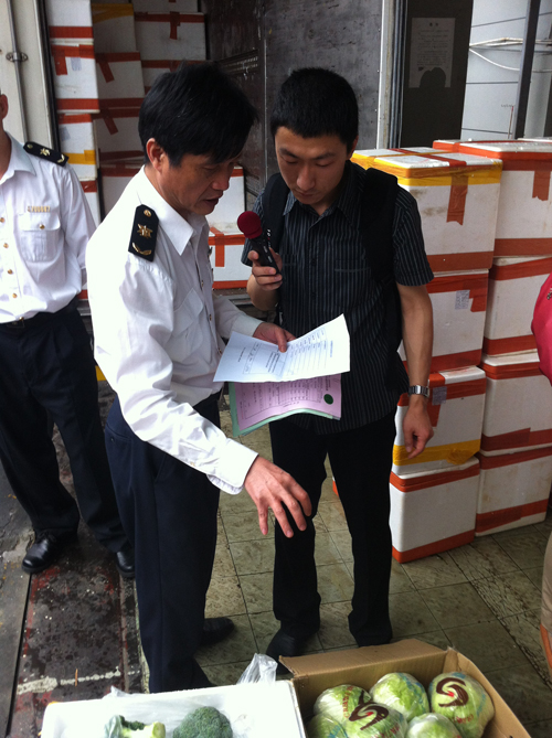 華夏之聲記者李鵬飛(右一)采訪供港澳蔬菜過關