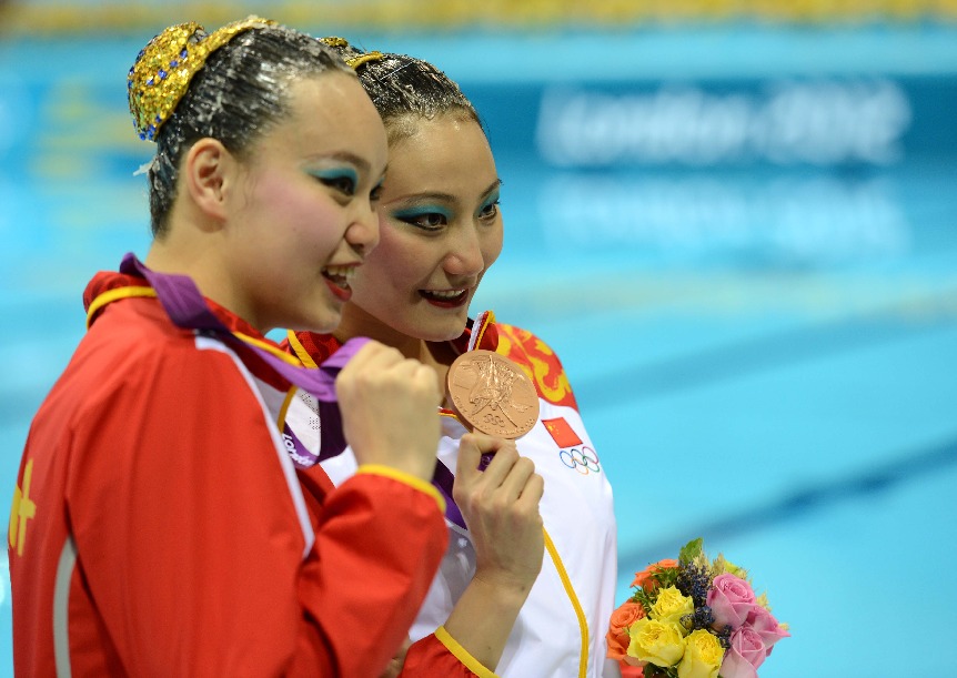 2012年8月7日花樣游泳雙人自由自選頒獎(jiǎng)儀式舉行,中國組合黃雪辰劉鷗(右)獲得銅牌