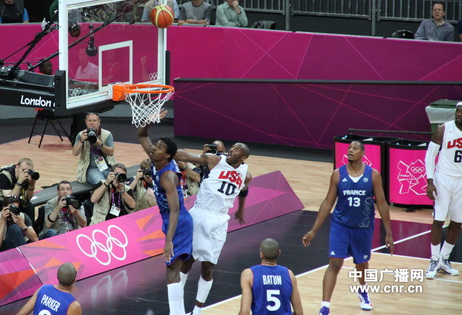 首節比賽,夢十不斷用快攻得分。首節還有6分42秒時,美國搶斷之后快速反擊,杜蘭特剛過罰球線就跳起,滑翔之后單手暴扣得分,連投帶罰拿下3分,美國以11-5領先。法國靠帕克組織進攻,一點點將比分扳回。在帕克率領下,法國本節只以21-22落后。