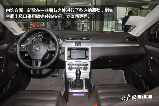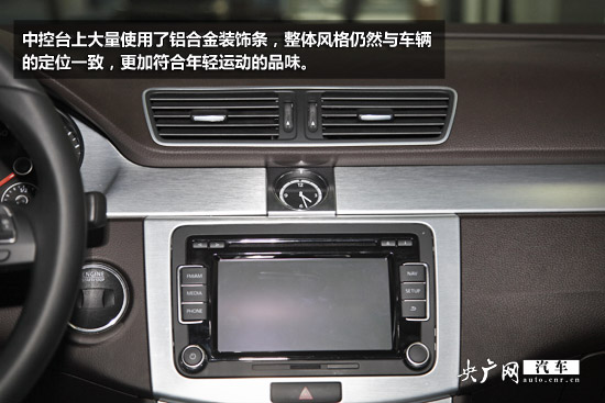 內飾方面,新款CC的改動很小,布局與現款車型幾乎完全一致,中控臺上大量使用了鋁合金裝飾條,整體風格仍然與車輛的定位一致,更加符合年輕運動的品味。其上面大多使用軟性材質,中間的6.5寸多媒體觸摸屏繼承了Media-Box多媒體接口、6碟CD等功能。