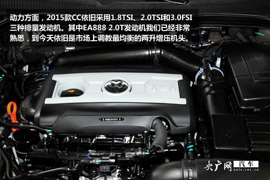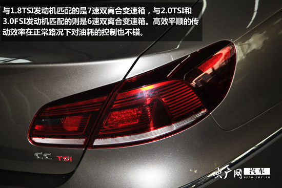 動力方面,2015款CC依舊采用1.8TSI、2.0TSI和3.0FSI三種排量發動機,與1.8TSI發動機匹配的是7速雙離合變速箱,與2.0TSI和3.0FSI發動機匹配的則是6速雙離合變速箱。高效平順的傳動效率在正常路況下對油耗的控制也不錯。