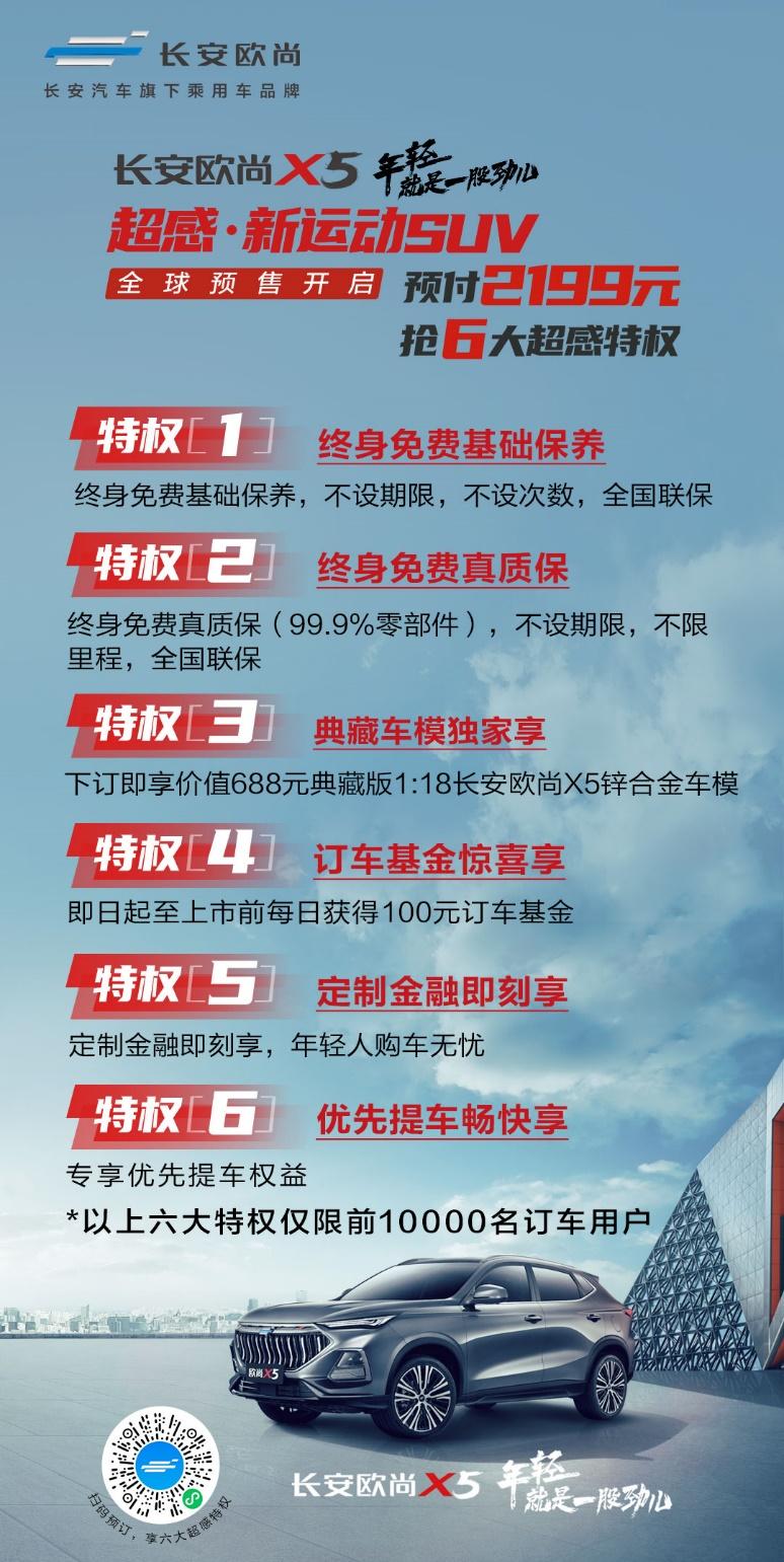 前不久的北京車展長安歐尚X5開啟了盲訂,預(yù)定開啟55小時定單就已突破2000輛,創(chuàng)造了每99秒就誕生一個定單的極致速度,其爆款潛質(zhì)已初步顯現(xiàn)。現(xiàn)如今長安歐尚X5已正式開啟全球預(yù)售,通過歐尚styleapp、歐尚style小程序、長安歐尚汽車官網(wǎng)、長安歐尚汽車官方微信公眾號,預(yù)付2199元,搶6大超感特權(quán),僅限前10000名訂車用戶。6.99萬-10.59萬的預(yù)售價格,6大超感特權(quán)的尊享福利,勢必將帶給消費者更多的價值和驚喜,未來其上市也將更加備受期待。