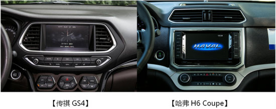 【內(nèi)飾中控】內(nèi)飾方面兩車都采用了搪塑工藝,使得兩款車都有很強的檔次感,哈弗H6 Coupe的內(nèi)飾延續(xù)了外觀簡潔大方的設(shè)計,中控整體以中軸線采用對稱布局,空調(diào)出風口、顯示屏、媒體按鍵分區(qū)明顯,商務(wù)科技范兒十足。反觀傳祺GS4,緊湊的布局使按鍵堆積到一起節(jié)省了空間,中控屏和出風口結(jié)合在一起使得本就不大的屏幕更加小巧。