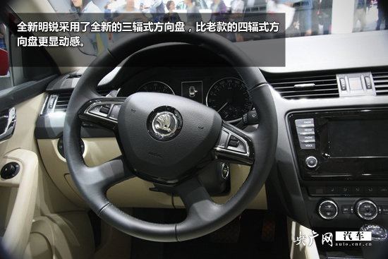 內飾方面,全新明銳內飾質感提升明顯,中控臺5.8寸液晶顯示屏比現款尺寸更大,功能按鈕布局清晰合理,手感良好。新明銳采用了全新的三輻式方向盤,比老款的四輻式方向盤更顯動感。