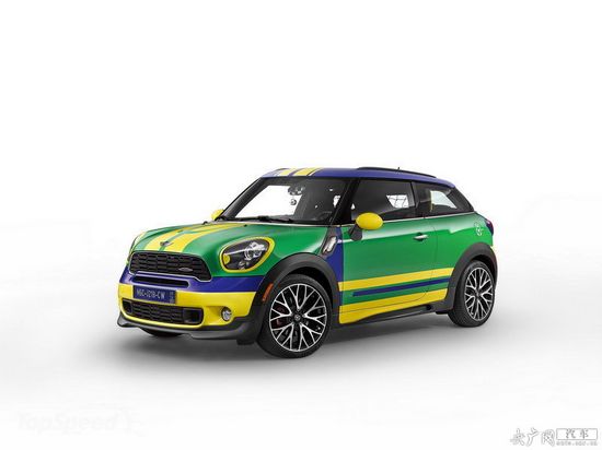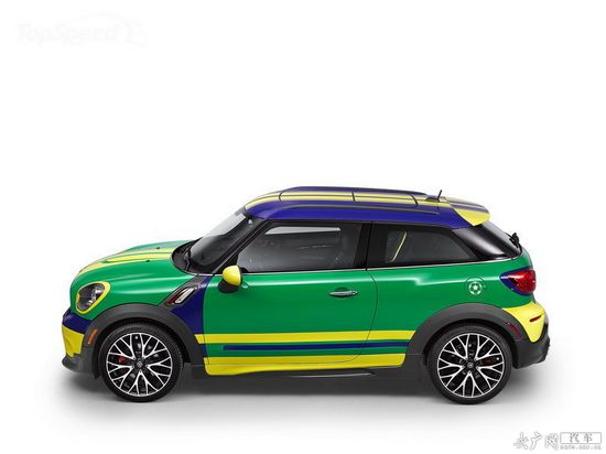 2014款MINI PACEMAN COOPER在MINI JONN COOPER WORKS PACEMAN的基礎上進行打造。車身涂漆配色方案的靈感來自巴西足球隊的隊服,黃綠相間,車頂圖案采用巴西國旗。
