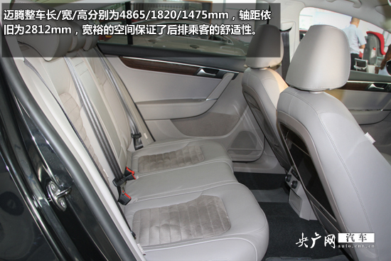 邁騰整車(chē)長(zhǎng)/寬/高分別為4865/1820/1475mm,軸距依舊為2812mm,寬裕的空間保證了后排乘客的舒適性。