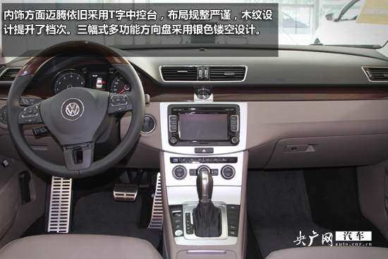 內(nèi)飾方面邁騰依舊采用T字中控臺(tái),布局規(guī)整嚴(yán)謹(jǐn),木紋設(shè)計(jì)提升了檔次。三幅式多功能方向盤(pán)采用銀色鏤空設(shè)計(jì)。