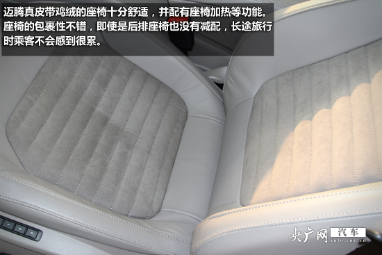 邁騰真皮帶雞絨的座椅十分舒適,并配有座椅加熱等功能。座椅的包裹性不錯(cuò),即使是后排座椅也沒(méi)有減配,長(zhǎng)途旅行時(shí)乘客不會(huì)感到很累。