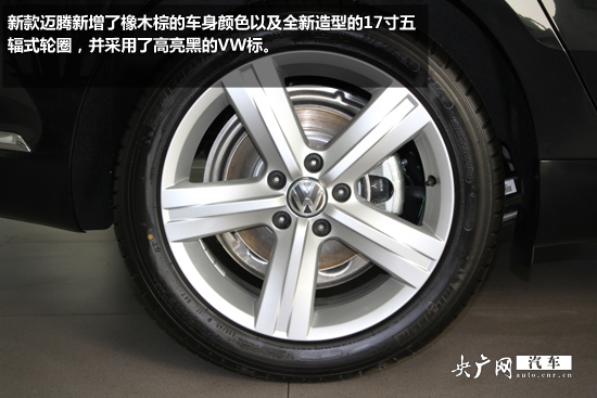 新款邁騰新增了橡木棕的車(chē)身顏色以及全新造型的17寸五輻式輪圈,并采用了高亮黑的VW標(biāo)。