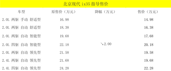 繼北京現代宣布調整全新勝達的市場指導價格之后,日前,北京現代再次宣布針對ix35的價格進行調整,據悉,ix35全系價格均下調2萬元。