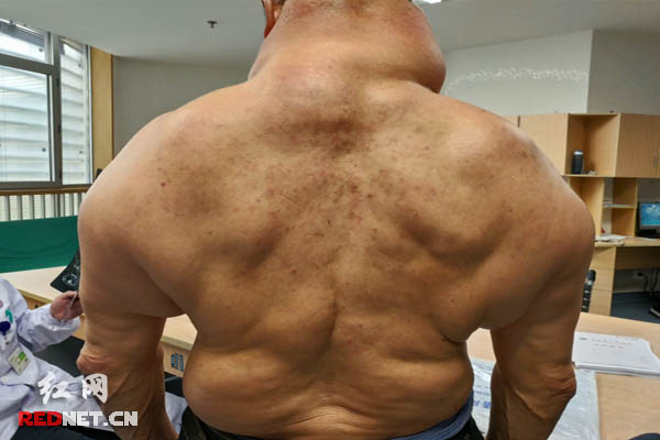 紅網時刻3月16日訊(記者 易征洋 通訊員 梁輝 劉小白)中國人的飲食和社交文化似乎少不了酒,但如果把握不好“小酌怡情,多飲傷身”的度,就可能危害身體健康。湖南湘鄉六旬老人喝酒半個多世紀,全身長出大大小小數十個脂肪瘤,就像是“綠巨人”的肌肉塊。尤其是頸部那一圈厚厚的脂肪,活像系了一條“肉圍脖”。經測量,他的頸圍達到68厘米,比很多人的腰還粗,就像“馬脖子”。