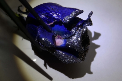 而“藍色妖姬”玫瑰,剛剛拆除外層的塑料紙便發(fā)現(xiàn),不僅玫瑰花瓣是藍色,連同玫瑰花托處的綠葉,也有一部分成了藍色。觀察花瓣后發(fā)現(xiàn),外層花瓣迎光看會發(fā)出蠟質(zhì)光澤,而它的花瓣與其他3色的玫瑰花比起來,要硬很多。稍稍用力觸碰,外層花瓣便會被折斷。僅撥開了外層花瓣,就已經(jīng)出現(xiàn)了一些淡粉色的斑塊,顏色很不均勻。