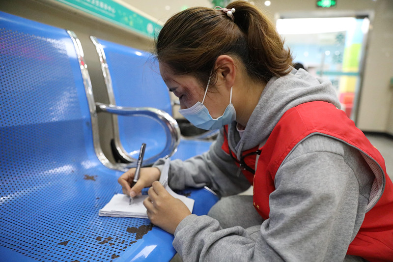 扎著馬尾,穿著紅馬甲,嗓音沙啞,戴著口罩也沒能遮住周麗左臉的傷痕。昨天早晨,也是在同樣的位置,周麗在引導居民有序排隊時被擁擠的人群擠倒,不小心摔了一跤,左臉碰到了綠化帶上,流了不少血,社區衛生服務中心的醫生給她做了緊急消毒處理,抹了點藥膏后叮囑她好好休息觀察一段時間。