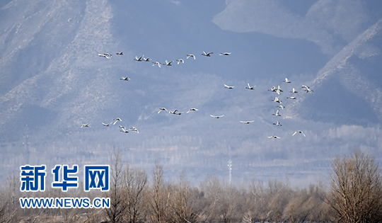 大批向北遷徙的天鵝在官廳水庫周邊飛翔。