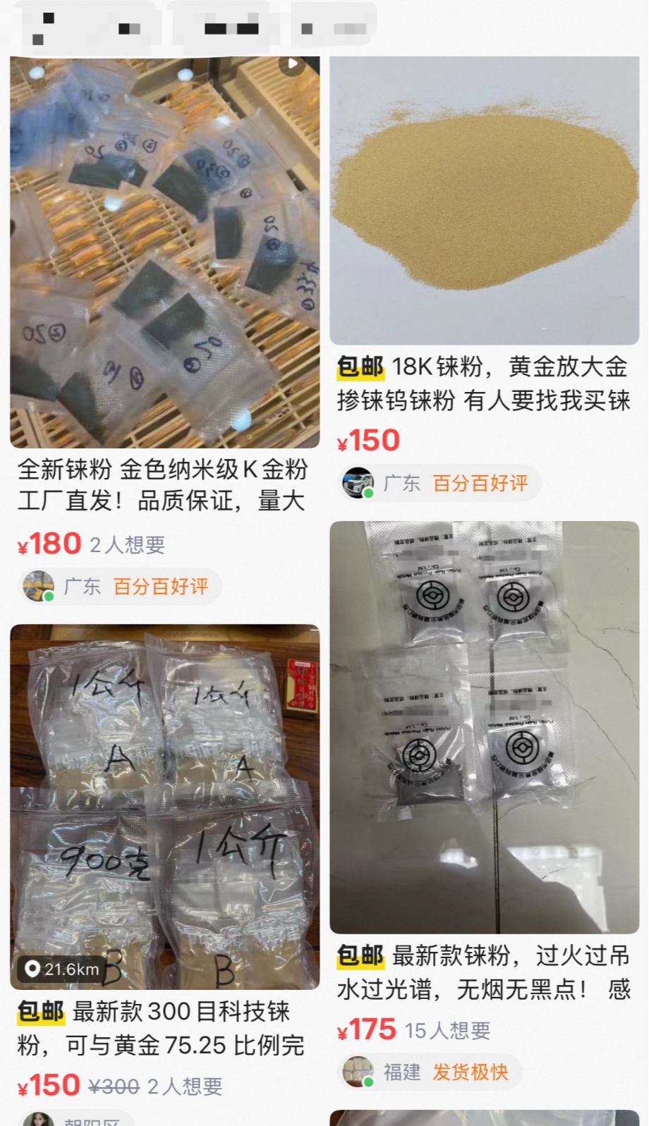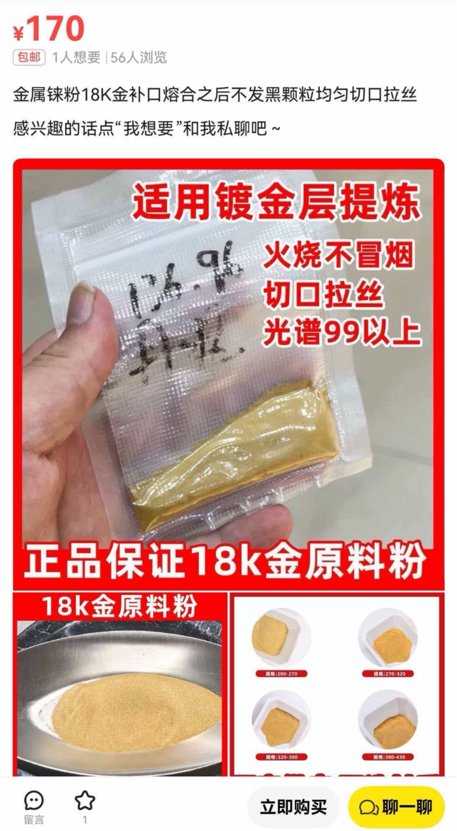 想買到視頻中的錸粉似乎并不困難,記者搜索二手交易平臺,大量商家在售賣這種錸粉,甚至有人在商品標題中就明確注明了“黃金放大”“過火過水過光譜”“與黃金75比25混合”等誘導信息。記者聯系了一家售賣錸粉的商家,對方保證能以假亂真。
