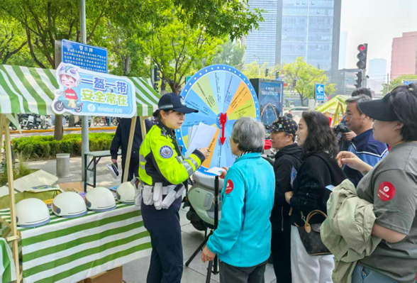 4月24日,北京交警在朝陽區(qū)三里屯路口向公眾宣傳非機(jī)動車管理新規(guī)(北京交警供圖)