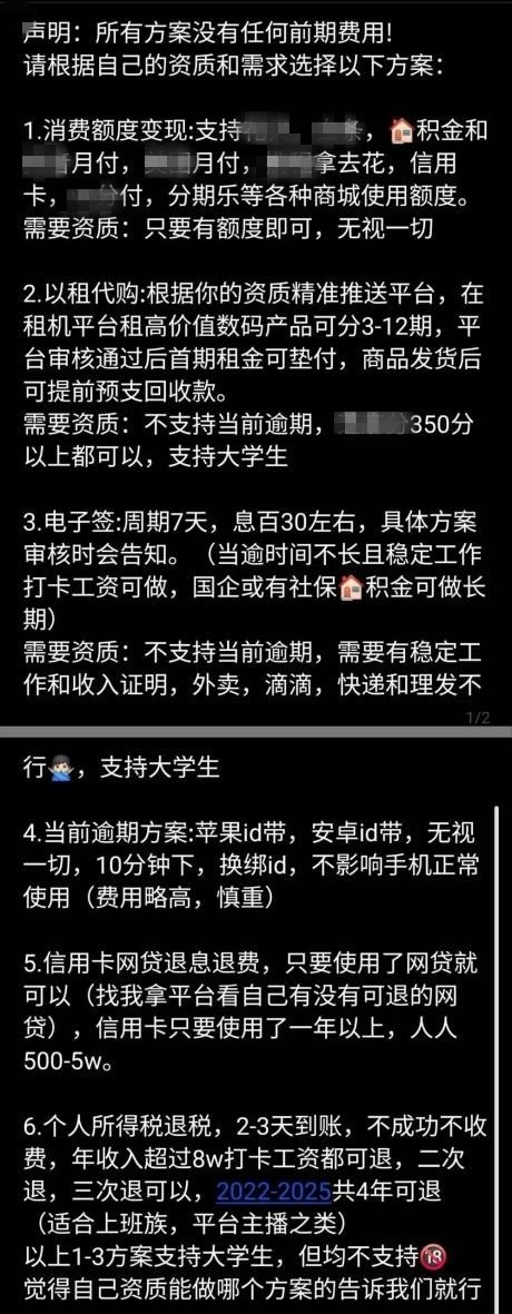 添加過后,對方很快發來了以租代購、電子簽、手機ID貸款、信用卡網貸退費等6種借款方案。若得知是在校大學生,對方還會推薦所謂的“大學生短期”方案,并保證“合法合規”。