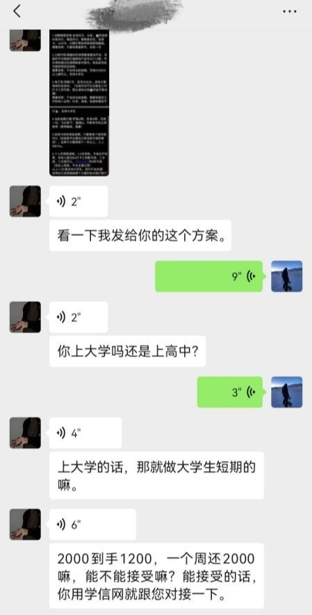 對方推薦的所謂的大學生短期借貸方案為借款1200元,一周后需還款2000元,號稱“利息相對來說比較低”。