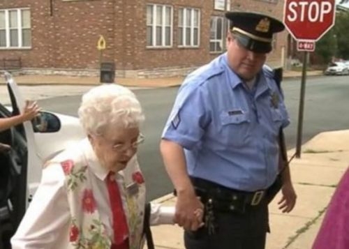 為了滿足西蒙斯的心愿,當地警方則配合這位童心未泯的老太太演上一出“逮捕劇情”。西蒙斯也配合的舉起雙手,讓警察給她戴上手銬。