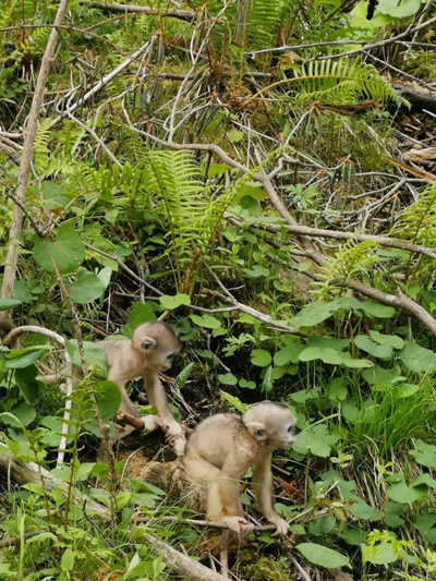 風聲、鳥聲、樹葉聲,夾雜著短促的嘶鳴。獨屬于山間的精靈忽然跳入眼簾,雄猴頂著一頭金紅的披肩、灰藍色的臉孔,威風凜凜地在林間騰躍,剛剛出生的小猴則害羞地往猴媽媽懷里鉆。一只渾身淺金色絨毛的小猴拉扯著我的鞋帶,忽閃著清澈的大眼睛定定地看著我。