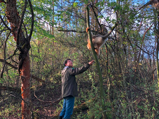 吳鋒和金絲猴握手問好(央廣記者凌姝 攝)