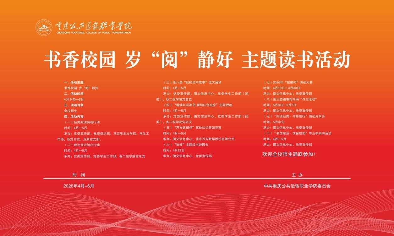 近日,為迎接全國首個“全民閱讀活動周”的到來,重慶公共運輸職業學院正式啟動2026年“書香校園 歲‘閱’靜好”系列主題讀書活動。