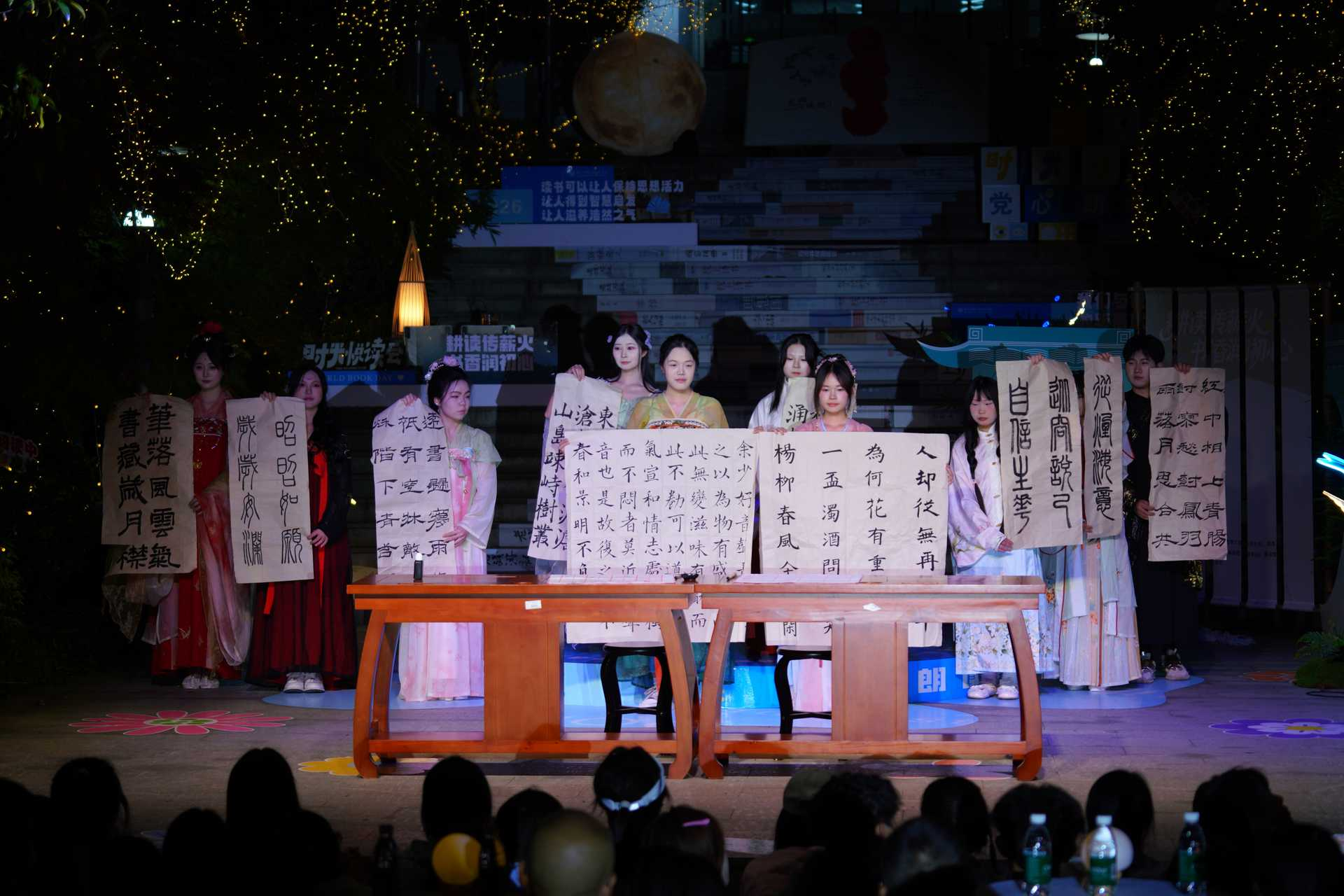 隨后,古箏《浮光》弦動流韻,拉開滿室書香。十余名師生同臺深情朗誦《廉潔頌》《請銘記·霧重慶》,字句鏗鏘,赤忱動容。樂隊彈唱《夜空中最亮的星》,旋律悅耳、青春意氣。非遺傳承人傾心指導的《宋韻點茶》《書香篆影》中,學子凝神執壺、擇香入爐,茶煙裊裊,篆影幽幽,一室風雅流淌。彝族與漢族學子攜手共唱《大山》,歌聲自山間來,情誼從心底生,民族團結的暖流將全場推向高潮。壓軸的《墨香華服》,筆走龍蛇間墨韻飛動,歷代華裳次第流轉,動靜相生,雅韻天成,為這場書香之約畫上圓滿句號。