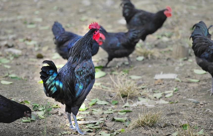 城口山地雞,重慶市城口縣特產(chǎn),全國農(nóng)產(chǎn)品地理標(biāo)志。城口山地雞體軀略偏長,胸部寬窄適中,羽毛較緊湊,顏色以黑(褐)色為主。公雞外觀威武雄壯,羽毛油亮,頭大小適中,單冠直立中等大小,冠肥潤、組織柔軟光滑,冠尖7-9枚,冠、耳葉、肉垂為紅色,喙多為蠟青色,稍彎曲,梳羽、蓑羽及主翼羽以火紅花羽為主,背長而直,胸骨長直,胸肌欠發(fā)達(dá),腹部多為黑羽,尾羽黝黑上翹,少量的公雞梳羽部有絲羽,腿及脛較長,脛部和腳部為青色,脛、腳毛少見,皮膚白色。母雞單冠直立相對較淺,頭較小,冠、耳葉、肉垂為紅色,羽毛以黑色為主,梳羽部有少量點狀火紅花羽,尾羽上翹,體形清秀。虹彩多為銅黃色或黑褐色,喙多為蠟青色、微彎曲,長短適中;脛較短,脛、腳均為青色,脛、腳毛少見,臀部豐滿而廣闊,皮膚白色。