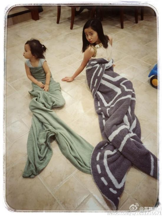 8月18日晚,黃磊更新微博曬一雙女兒搞怪照,照片中,多多和妹妹坐裹著浴巾坐在地上,浴巾末端還被擺成了剪刀形,兩姐妹扭頭嘟嘴賣萌,十分可愛。黃磊寫道:“家里來了兩條小美人魚……” 照片曝光后,網友紛紛留言:“我想起黃磊在極限挑戰里面的美人魚樣子了,辣眼睛。