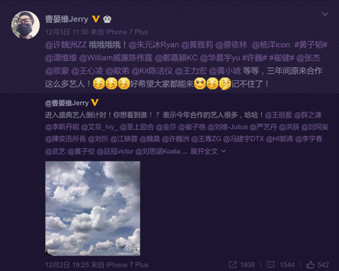 不料隨后@曹晏維Jerry再次發(fā)微博表示:“三年間原來合作了這么多藝人,好希望大家都能來!”又附上一份長長的明星大咖名單。網(wǎng)友只能表示:“走過最深的路,就是你的套路”。看來2016酷狗直播繁星音樂盛典的明星出席名單仍然深埋在一片迷霧中,不過無論如何,@曹晏維Jerry都為大家劃定大致范圍了,至于究竟有誰?粉絲們還是乖乖等官方消息吧~