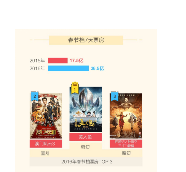 自2010年起,中國(guó)電影票房一直保持著高速增長(zhǎng)。2016年初,《美人魚》《澳門風(fēng)云3》《西游記之孫悟空三打白骨精》等春節(jié)檔大片繼續(xù)攪熱中國(guó)電影市場(chǎng)。據(jù)淘票票《2016年中國(guó)影市報(bào)告》數(shù)據(jù)顯示,春節(jié)檔7天上映的9部影片聯(lián)手貢獻(xiàn)了36.5億票房,相比去年同比增長(zhǎng)19億。其中,《美人魚》更是創(chuàng)下了33.9億的票房奇跡。