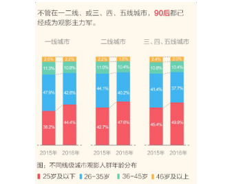 近年來(lái),中國(guó)電影市場(chǎng)急速擴(kuò)張,“網(wǎng)生代”觀眾電影消費(fèi)能力漸強(qiáng)。2016年,90后群體已成功超越80后成為新一代票房主力軍。《2016年中國(guó)影市報(bào)告》顯示出,不管在一二線、或三到五線城市,90后群體占比都明顯上漲,這些年輕觀眾不僅熱忱度高,且在觀影、影片互動(dòng)上均十分活躍,顯現(xiàn)出了對(duì)于票房巨大的影響力。