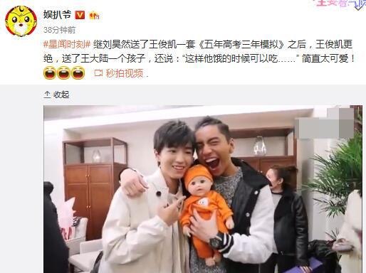 2月21日,據(jù)博主“娛扒爺”爆料,王俊凱近日碰到王大陸,一見面,他就送了王大陸一個“孩子”——當然是個公仔娃娃啦,然后還調(diào)侃說王大陸?zhàn)I了可以吃。