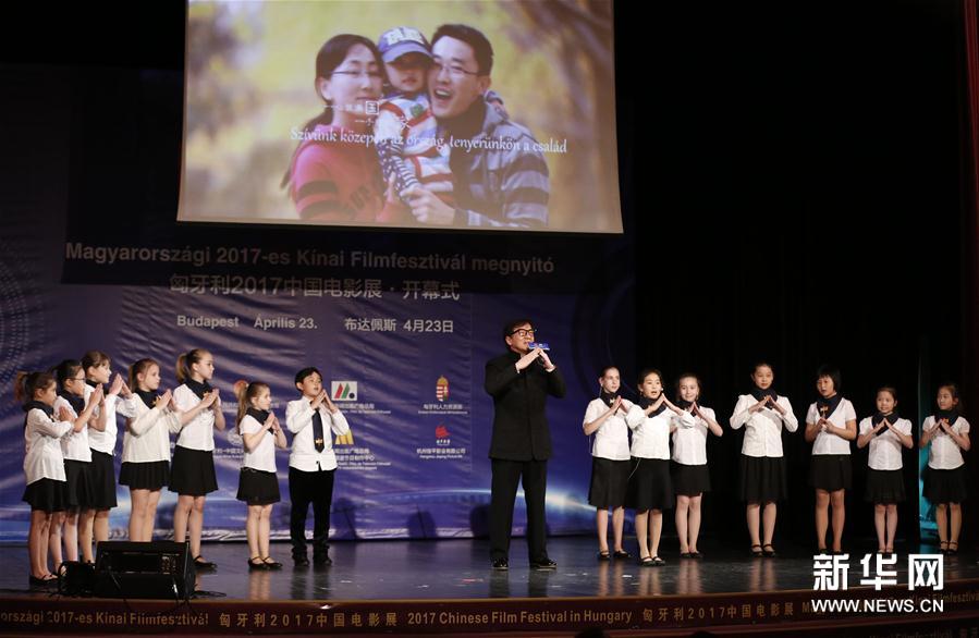 4月23日,在匈牙利首都布達佩斯舉行的2017中國電影展開幕式上,中國香港演員成龍(中)與匈中雙語學校的學生演唱歌曲《國家》。 2017中國電影展23日在匈牙利首都布達佩斯開幕。在歷時7天的電影展期間將放映《功夫瑜伽》《大唐玄奘》《湄公河行動》《北京遇上西雅圖之不二情書》《山河故人》等5部優秀中國影片。新華社記者葉平凡攝 -