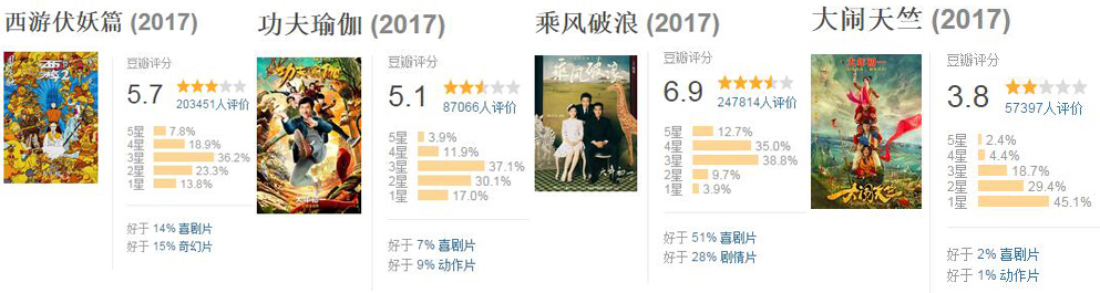 2016年的中國電影市場在眾多“聲音”和“現(xiàn)象”中結束,2017春節(jié)檔成為觀眾期待的電影盛宴,《西游伏妖篇》、《功夫瑜伽》、《大鬧天竺》、《乘風破浪》等影片吊足了觀眾胃口,但這聲勢浩大的表象背后卻依然是讓觀眾差強人意的質(zhì)量。除《乘風破浪》后來居上實現(xiàn)口碑票房逆襲外,其余影片均沒有獲得觀眾好評,豆瓣評分均未過及格線,《大鬧天竺》更是只收獲3.8分。回想《大鬧天竺》深入三四線城市“60天50城”的賣力宣傳,隱約透出一絲尷尬的氣息。