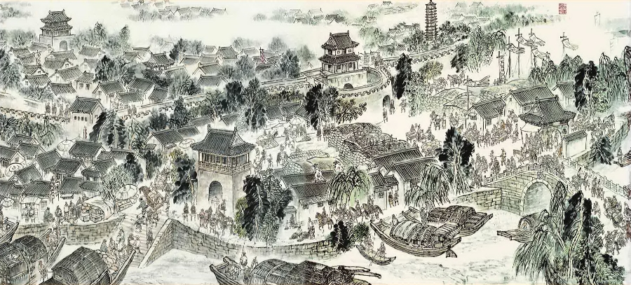 公元新世紀開元之年,華夏再沐朝陽,春風又綠神州。翰墨歌盛世,丹青寄赤心。谷建華先生以振奮民族精神為宗旨,以弘揚運河文化為己任。斥巨資,募群賢,研史料,重考察,集眾家之才智,請諸師之妙筆,穿越六百年時空,探尋當年漕運盛景。歷時五載,征修四次,終成《古運回望圖》。