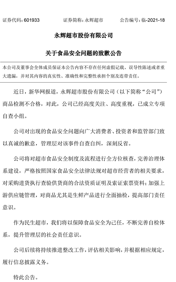 4月16日,永輝超市發布關于食品安全問題的致歉公告:公司對出現的食品安全問題向廣大消費者、投資者和監管部門致以真誠的歉意,管理層對該事件自查自糾,深刻反省。