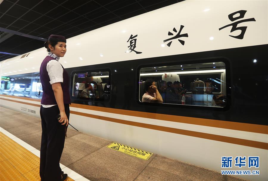 “復興號”以350公里時速的正式運營,標志著我國成為世界高鐵商業運營速度最高的國家。今年開跑的“復興號”在京滬高鐵實現350公里時速運營,再次創造了領先世界的中國速度。目前,中國鐵路在勘察設計、工程建造、高速動車組、列車控制、牽引供電、運營管理、安全保障等領域已經取得一系列自主創新成果,中國鐵路總體技術水平已邁入世界先進行列,部分技術處于世界領先水平。作為中國“新四大發明”之一,高鐵不僅安全、便利、快捷地服務著中國旅客,同時也驚艷著世界。 G1次“復興號”列車駛出北京南站(9月21日攝)。新華社記者 羅曉光 攝 -
