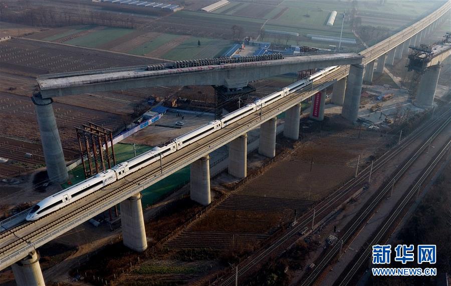 12月19日,一列高鐵從轉體成功后的商合杭高鐵跨鄭徐高鐵T構梁下駛過。商合杭高鐵線路全長794.55公里,設計時速350公里。今年開跑的“復興號”在京滬高鐵實現350公里時速運營,再次創造了領先世界的中國速度。目前,中國鐵路在勘察設計、工程建造、高速動車組、列車控制、牽引供電、運營管理、安全保障等領域已經取得一系列自主創新成果,中國鐵路總體技術水平已邁入世界先進行列,部分技術處于世界領先水平。作為中國“新四大發明”之一,高鐵不僅安全、便利、快捷地服務著中國旅客,同時也驚艷著世界。新華社發(李嘉南 攝) -