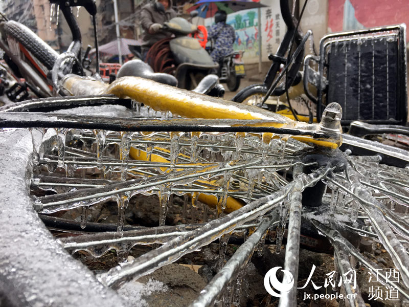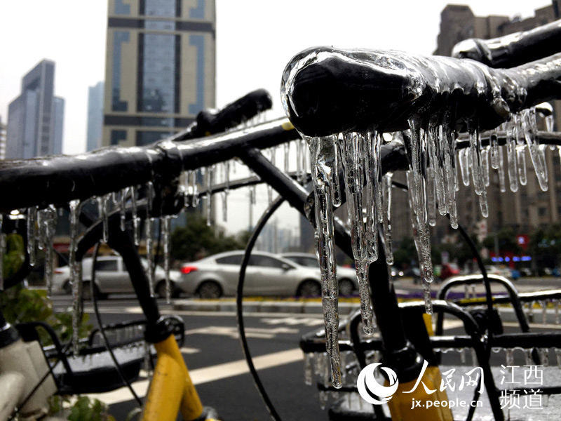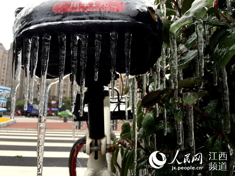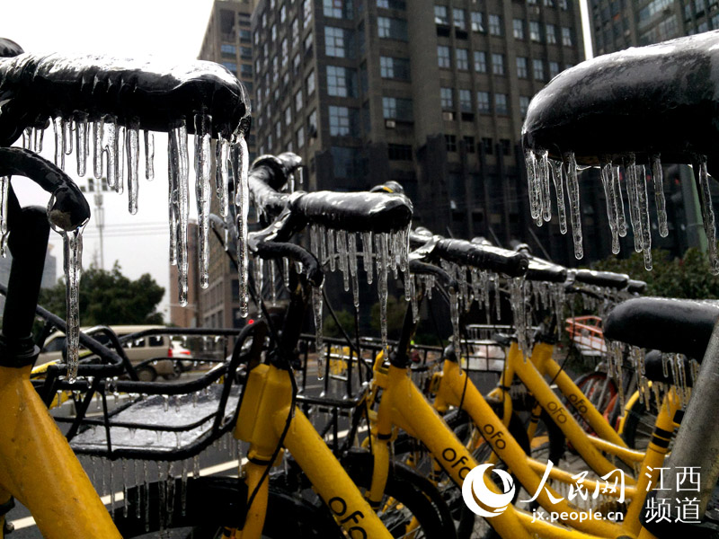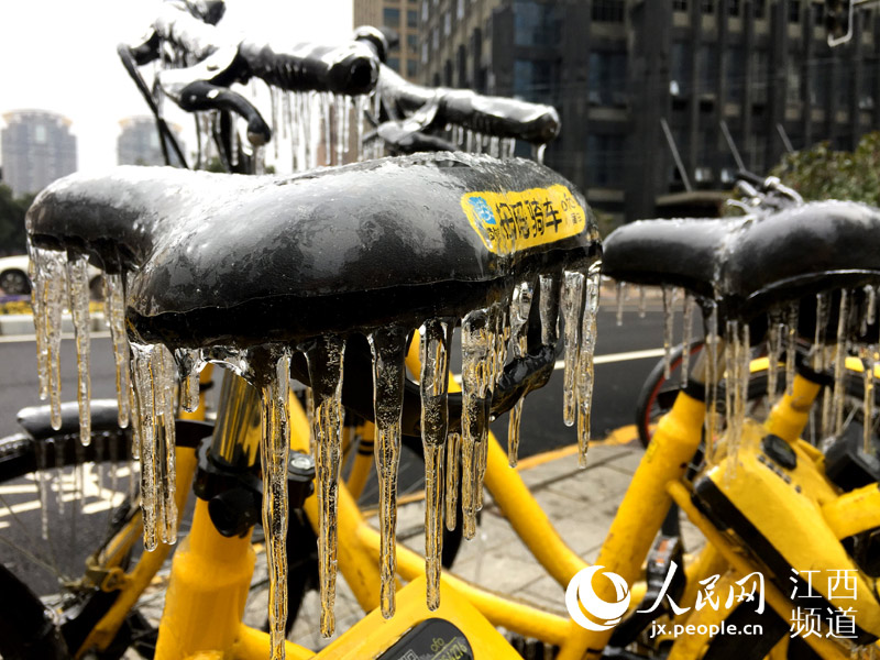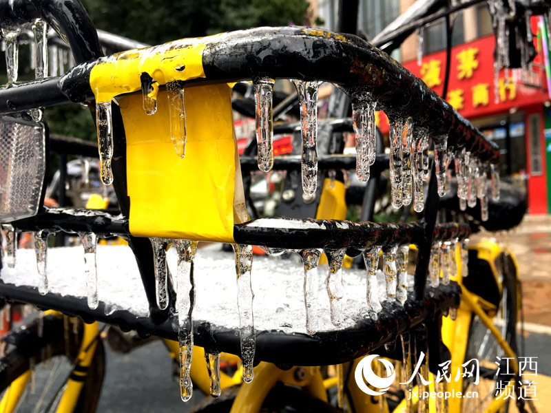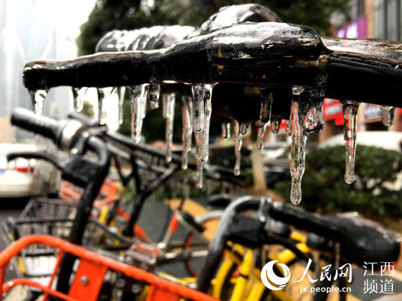 人民網(wǎng)南昌1月28日電(時(shí)雨)連日來,南昌遭遇低溫凍雨天氣,夜間的溫度跌至0℃以下。28日,本網(wǎng)在南昌街頭看到,低溫加凍雨使戶外的物體裹上了厚厚的“冰衣裳”,散落在街頭的各類共享單車不少已經(jīng)成為“冰雕”,車把手、車筐甚至車輪胎都結(jié)了冰,這些被“冰封”的共享單車停靠在路邊無人問津。 -