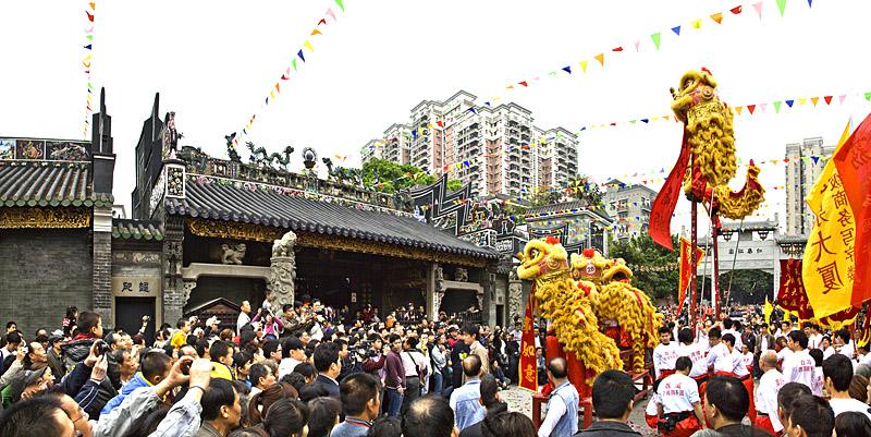 文化傳承荔灣情。按傳統風俗,泮塘村及附近友好村都會在三月初三當日自發齊集仁威廟舞獅為北帝賀壽,當晚村民及前來賀壽村民代表會齊聚梁家祠,參加百圍宴,并舉行盛大的梁氏宗親竟投民俗活動。