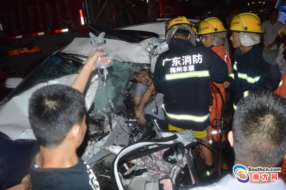 南方網訊 5月4日凌晨3時許,梅州市豐順縣消防大隊接到群眾報警稱,位于豐順縣湯坑鎮環城路豐順大橋附近一輛大貨車與一輛小車相撞,并有人員被困,情況萬分緊急。接到報警后,豐順消防大隊立即出動2輛消防車火速趕赴現場進行救援。