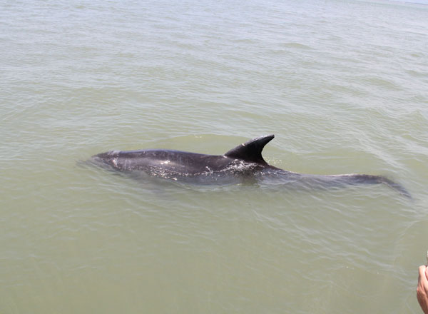 5月30日上午8時許,在海陵灣陽江港附近海灘游玩的群眾看到海灘上有一只受困的黑色海豚,迅速報警求助。看到海豚身體露在水外,可能有生命危險,群眾一起將海豚往水里推了十幾米,但海豚仍不能游回大海,只能在近海淺水里慢速游動。